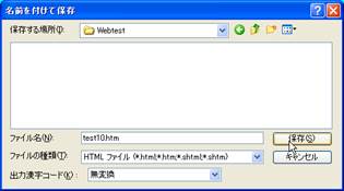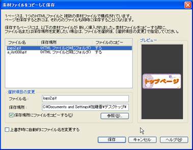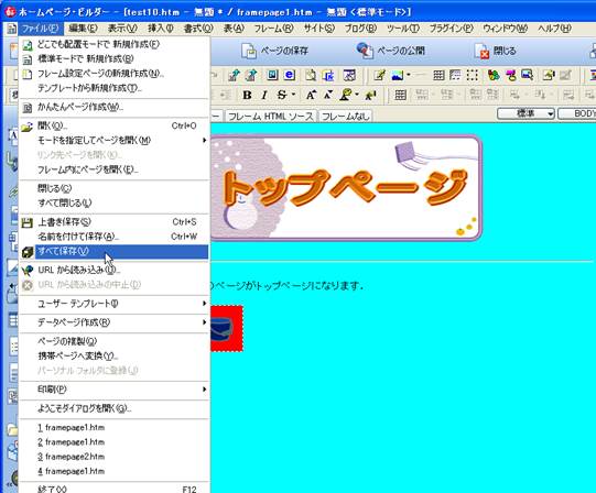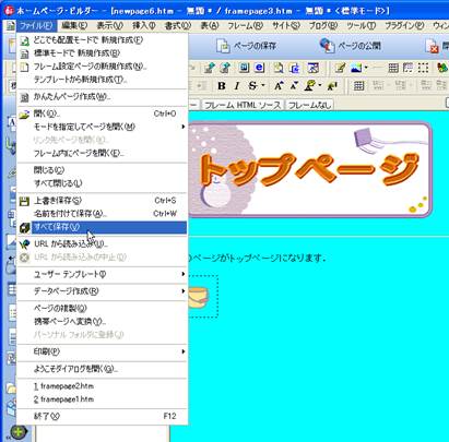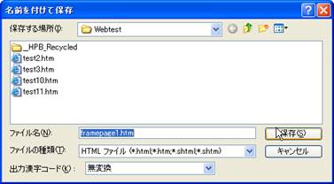 14. ここまでできましたら,とりあえず,一度すべてを保存しておきます.メニューバーの「ファイル」から「すべて保存」を選択します.今回,フレームを使用しているため,フレームの数に応じたWebページのファイルとフレームレイアウトのファイルができることになります.目次のページを「test10.html」,トップページを「test11.html」とします.また,ページ内に画像などのファイルがある場合には,「素材ファイルをコピーして保存」というウインドウが表示されます.今回は変更せずに保存しておきます.最後に,フレームレイアウトのファイル名を入力して保存が終了します.今回は,「frame1.html」としておきましょう.なお,保存する場所は,講義時間は,ディスクトップ上で作業しましょう.