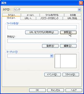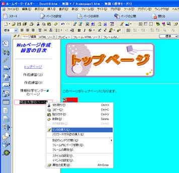 15. 次に,目次ページのそれぞれの項目にリンクを設定していきます.リンクを設定したい文字列を選択し,マウスの右ボタンで,プルダウンのメニューから「リンクの挿入」を選択します.属性のウインドウで,リンクしたい場所の設定を指定します.ファイルからの場合には,「ファイル」を選択して,参照先のファイルを開きます.URLの場合には,URLを選択し指定するURLを書き込みます.選択されたページを開きたい位置をターゲットとして指定します.今回の場合には,フレームの左右,全画面,新しいウインドウなどが設定できます.