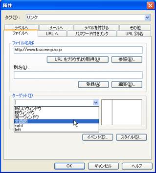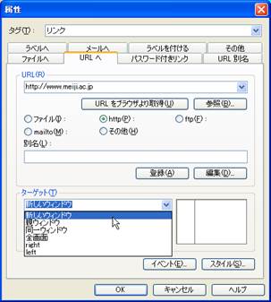 明治大学のページは,URLとして,http://www.meiji.ac.jpを指定します.ターゲットは「新しいウインドウ」としてみましょう.