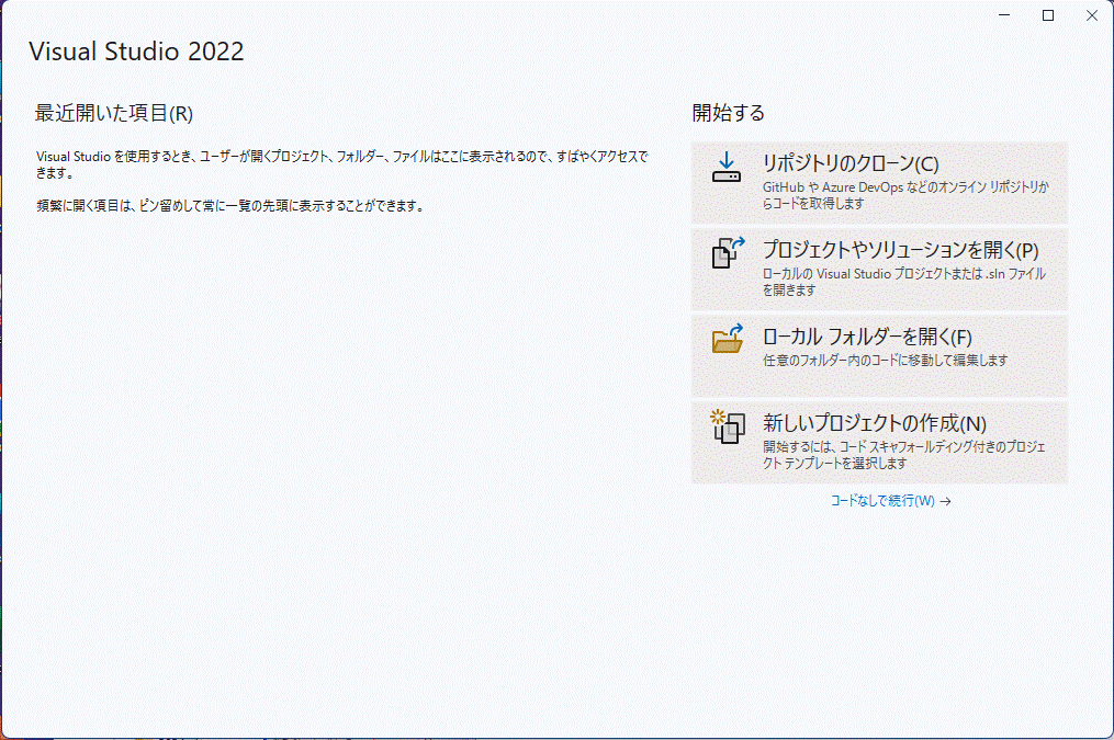 もしも以下のような画面(以下は2019の画面ですがほぼ、2022も同じです。)でしたら、下のように左上のメニューバーのファイルから「新しいプロジェクトの作成いてください。