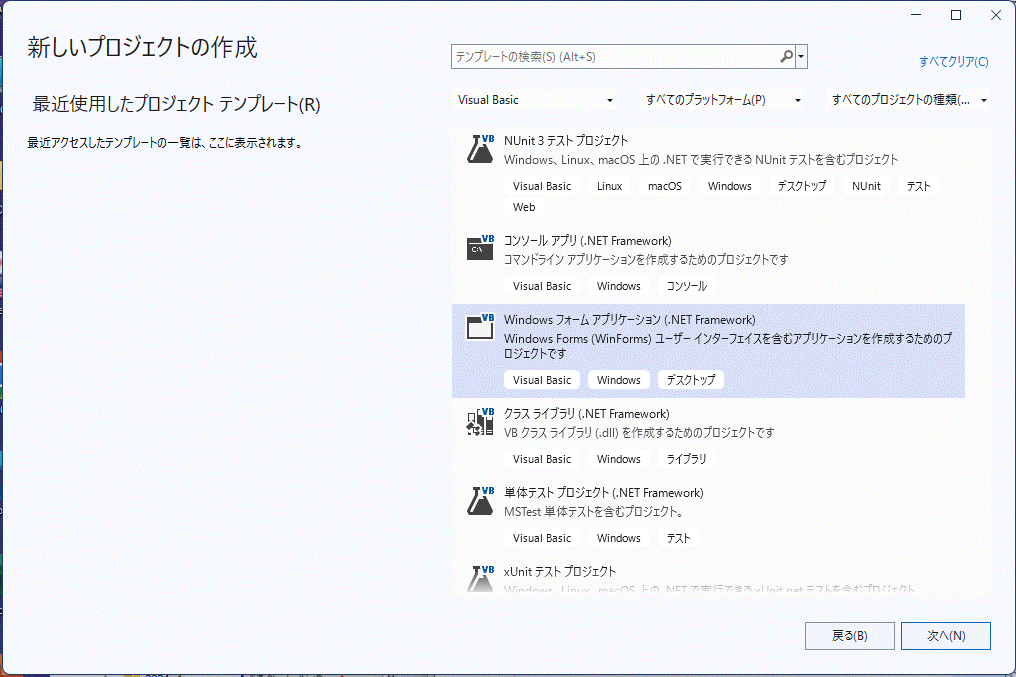 2019の場合には、新しいプロジェクト作成のウインドウの右の中のVisual Basicの中の「Windowsフォームアプリケーション」を選択して次へと押してください。