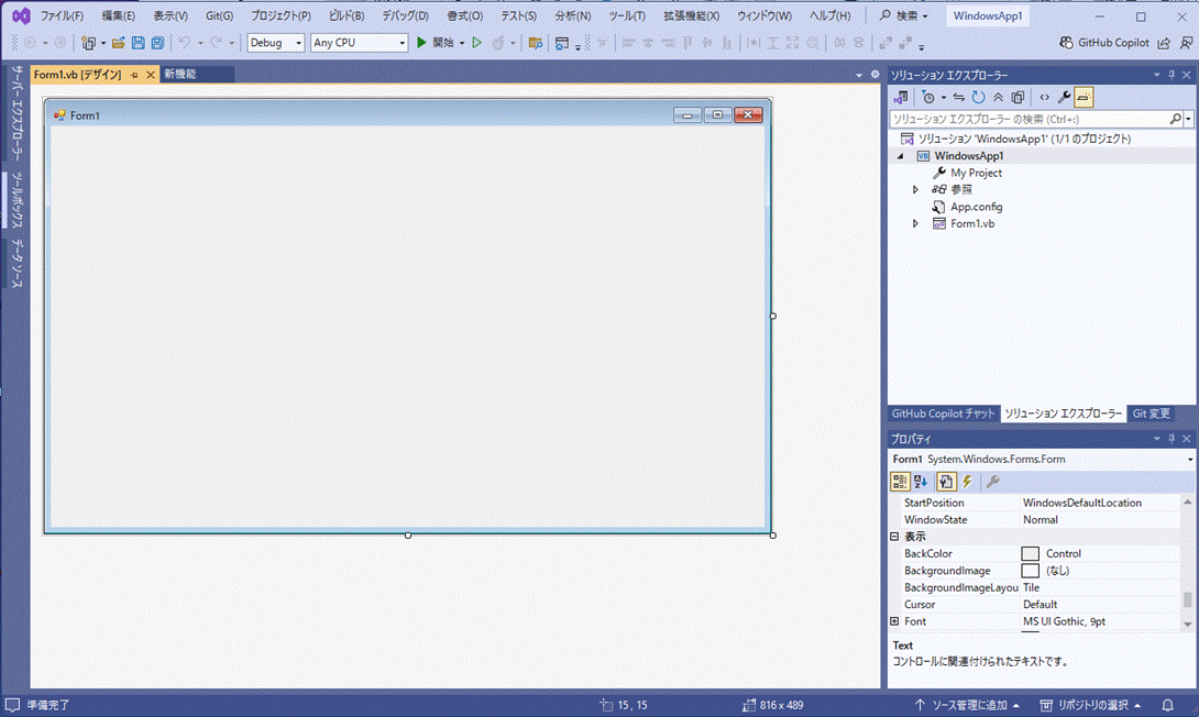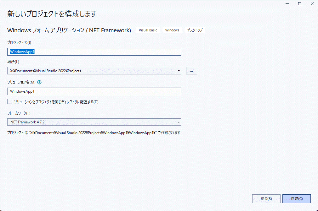 プロジェクト名は「WindowsApp1」は、既に一度作成されている場合には、順番に数値が大きくなっていきます。「WindowsApp2」などになっていれば,そのままにしておきましょう.