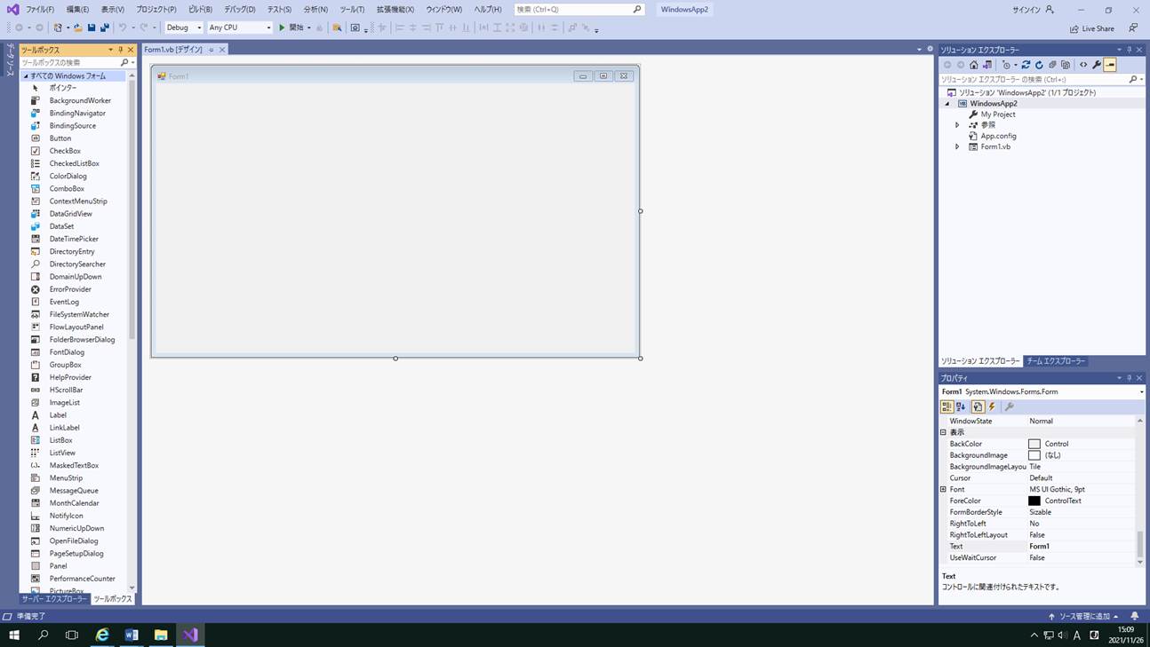 ○Visual Basic 2019では以下のような基本画面が現れます。左のツールボックスが表示されていない場合には、さらに下記の作業を行って表示されるようにします。