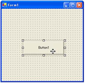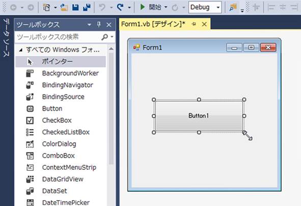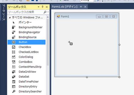2.ボタンを配置してみましょう.マウスの矢印が+になるのでマウスを動かしてフォームのどこにボタンを配置するかを決めてその位置でマウスの左ボタンを押したまま右斜め下に引っ張って適度な大きさで離すと"Button1"というボタンがフォームにできます。