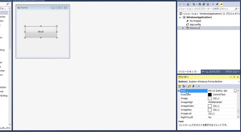 今はまだボタンの文字がButton1になっていると思います。そこでまず、配置したボタンを一回クリックして選らんだ状態にします。それから先に述べたこのButton1に対するプロパティウインドウのTextの部分を選択し,文字を書き換えます。字の大きさや形はプロパティウインドウのFontで変えることができます。