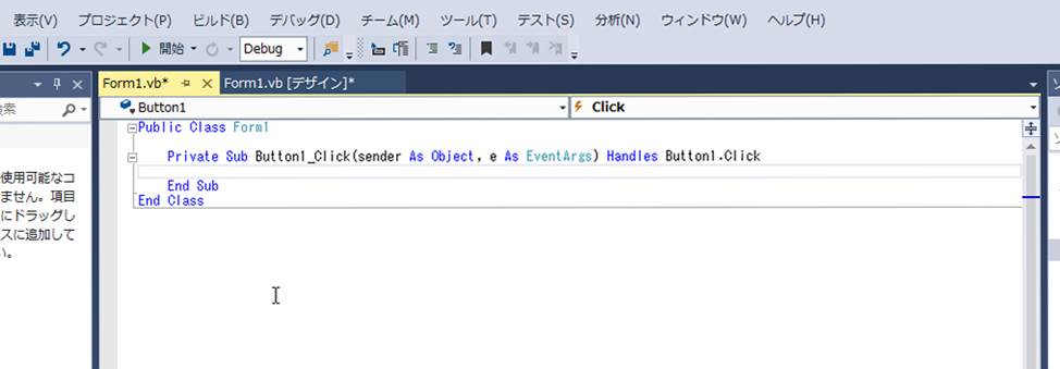 今回の例はボタンを押すと”クリック”から”終了”に文字が変わるようにします。そこでその動作を実際に書いておく必要があります。まず、ボタンをダブルクリックし、そのあとに開いたウインドウ(コードエディタ)の中に動作命令を書きます。
