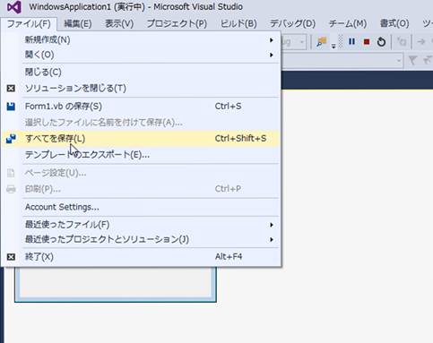 7.すべてを保存でここまでを保存してみましょう。名前は,プロジェクトファイルは,“WindowsApplication1”と,フォームは” Form1.vb”となります.(名前をつけて保存する場合には,その上の「名前をつけてForm1.vbを保存」を選択します.)