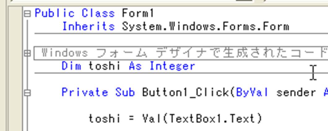 入力値(西暦の年号)は,TextBox1(中身は,TextBox1.Text)に入力されますが,これは,文字列であるため数値として,このtoshiという変数に代入する(イコールを使って,右側に示すものを左側の中身として置き換える)必要があります.