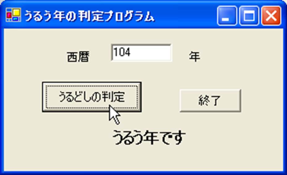 うまく行けば文字入力の部分をクリックして年数を入力し、計算ボタンをクリックするとうるう年かどうか判定します。
