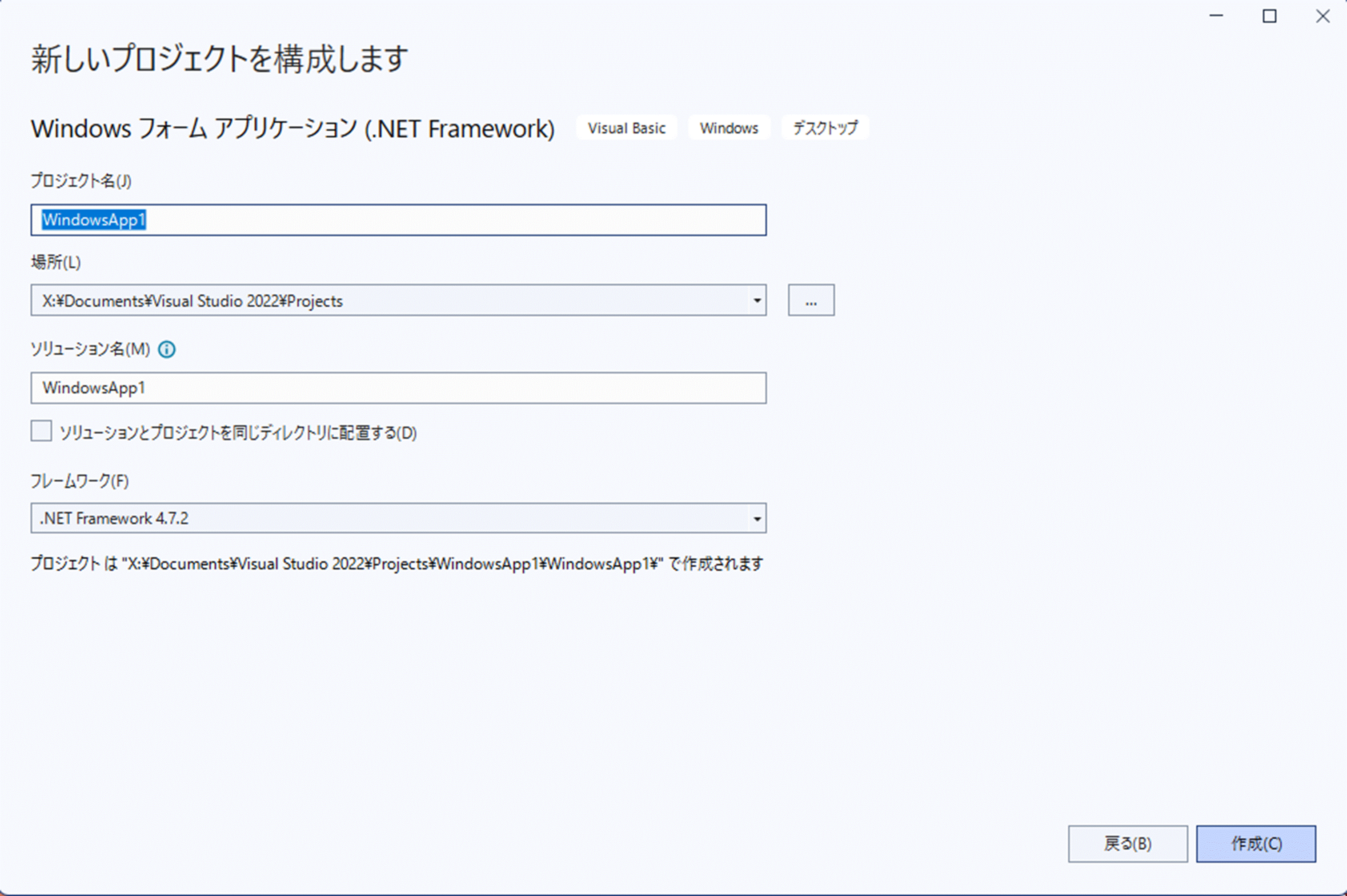 プロジェクト名は「WindowsApp1」は、既に一度作成されている場合には、順番に数値が大きくなっていきます。「WindowsApp2」などになっていれば,そのままにしておきましょう.