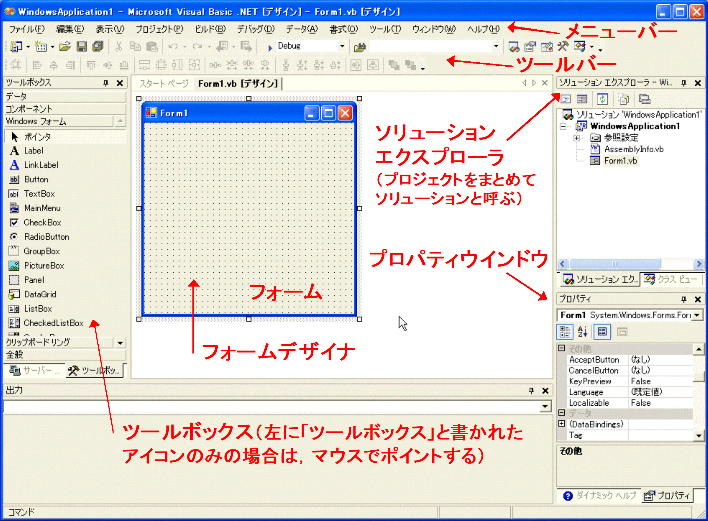 以下のような基本画面が現れます。(以下のものは,Visual Studio.NET 2003のものですので,若干配置などが異なります.以下の基本画面は,メニューバーの「表示」を用いて,それぞれのウインドウを表示するか,非表示にするかなどの選択ができます.表示が異なってしまった場合などは,ここで調整してください.)