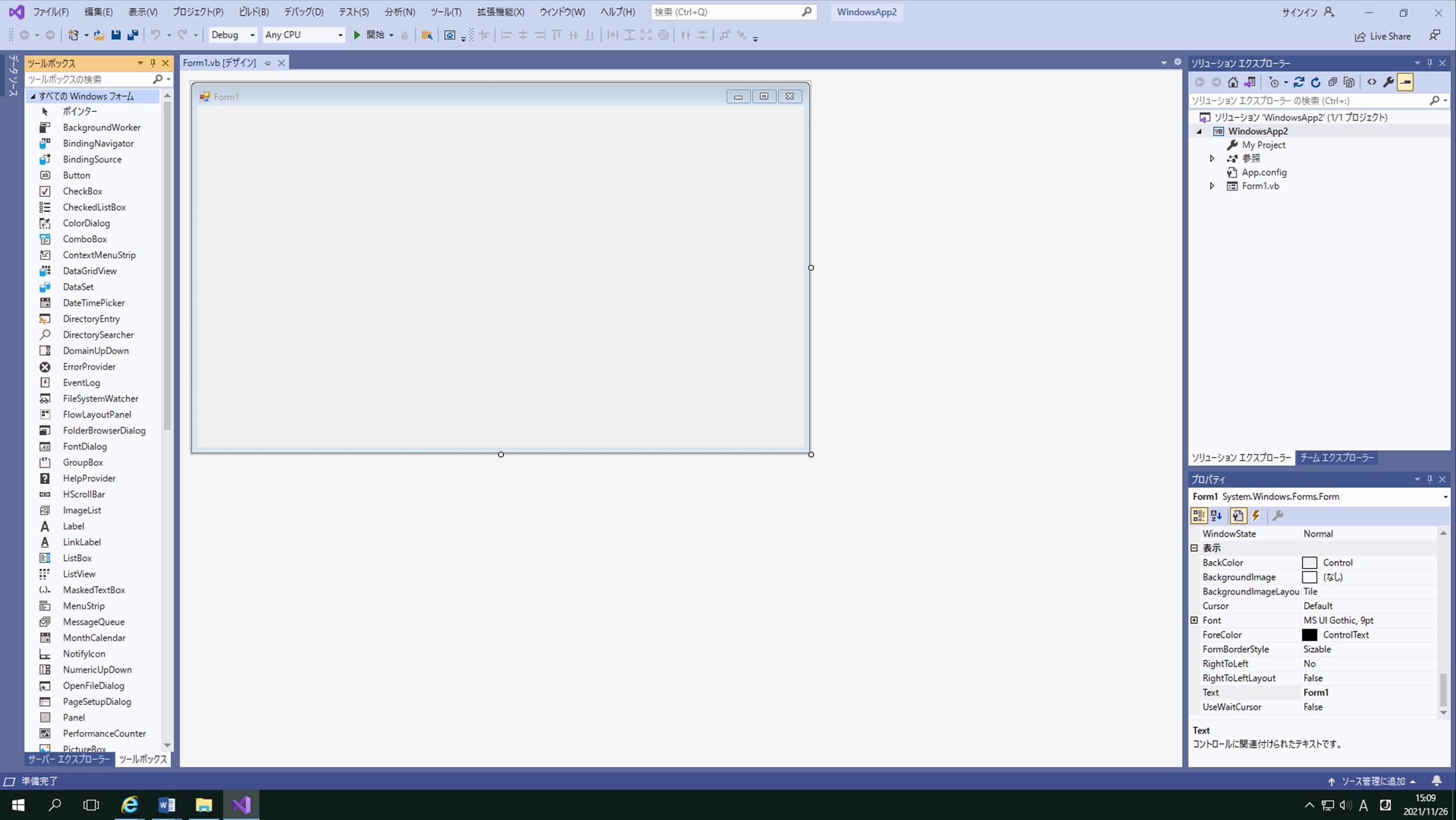 l フォームデザイナを使ってフォーム上に実際のプログラムが実行された際に表示されるウインドウを設計していくことになる.