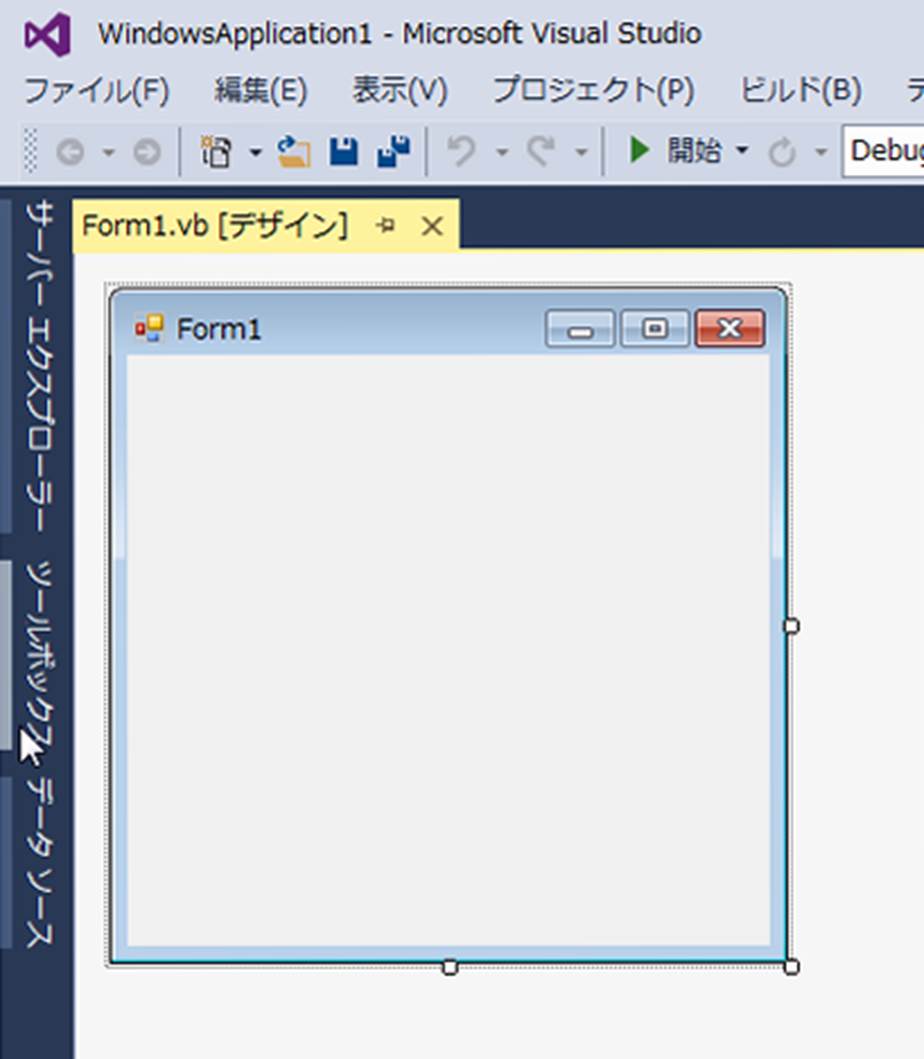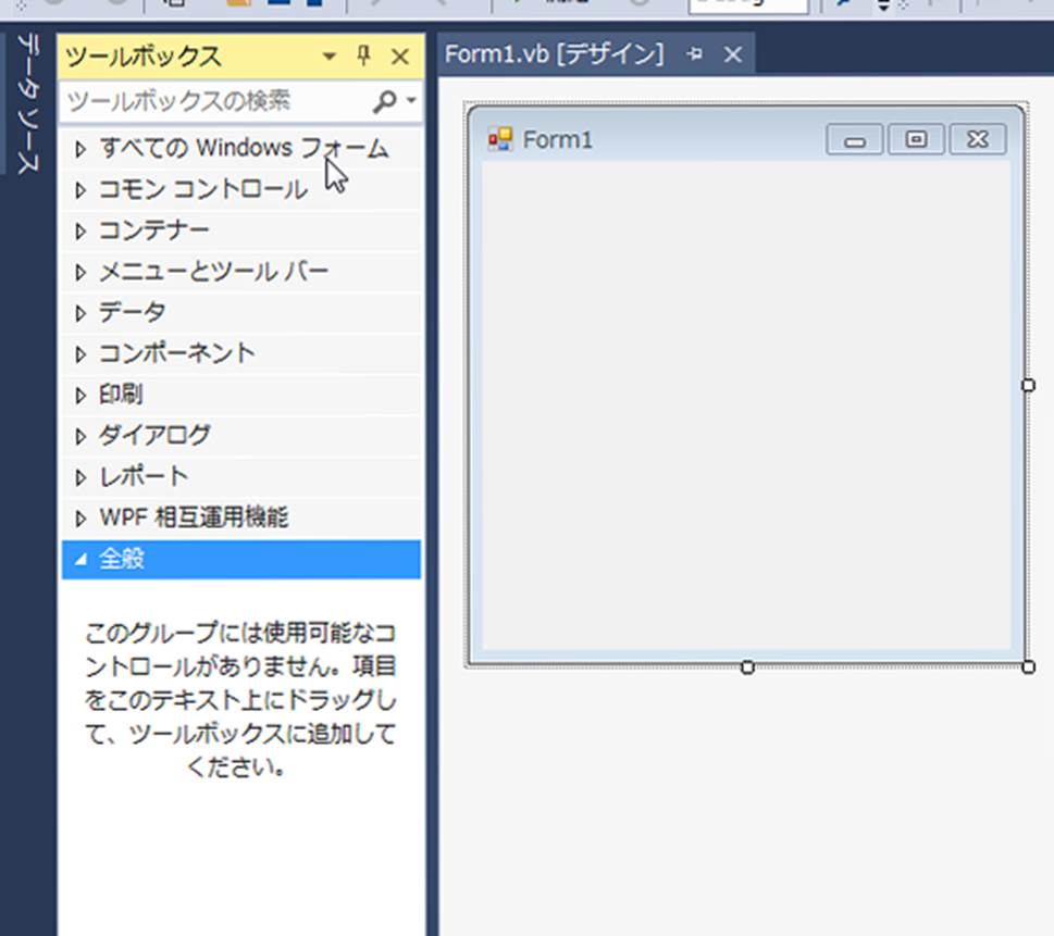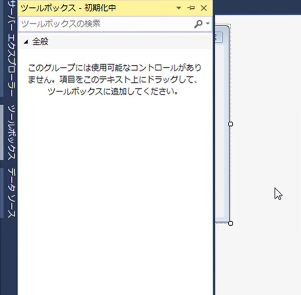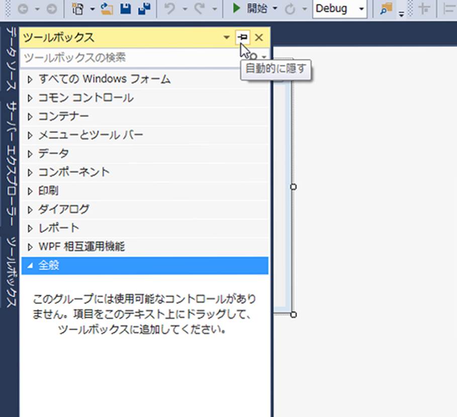 もしもツールボックスが表示されていないときには、左のツールボックスと書かれたアイコンをクリックし、初期化をします。表示されたメニュー上の「自動的に隠す」ボタンをクリックして、常に表示させるようにします。また、ツールボックスの中身は「すべてのWindowsフォーム」を選択して、表示させておきます。