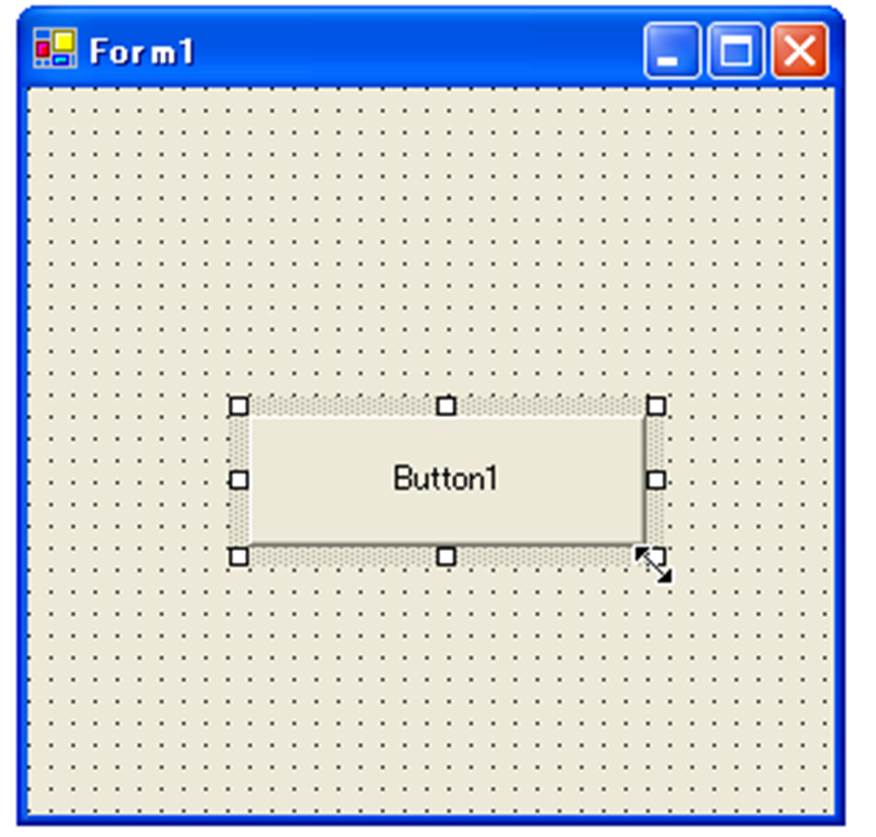 2.ボタンを配置してみましょう.マウスの矢印が+になるのでマウスを動かしてフォームのどこにボタンを配置するかを決めてその位置でマウスの左ボタンを押したまま右斜め下に引っ張って適度な大きさで離すと"Button1"というボタンがフォームにできます。