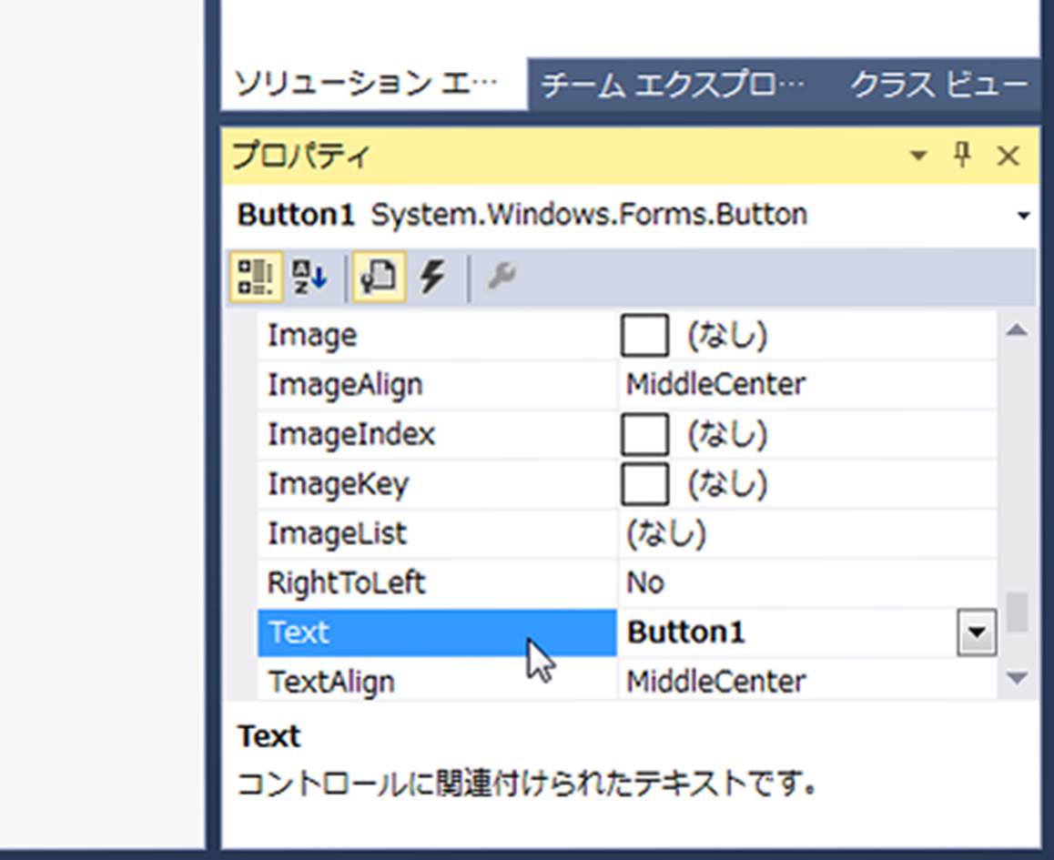 プロパティウインドウを見るとボタンの名前は,Button1であることがわかります.プロパティとは,性質,特性,属性を意味しています.