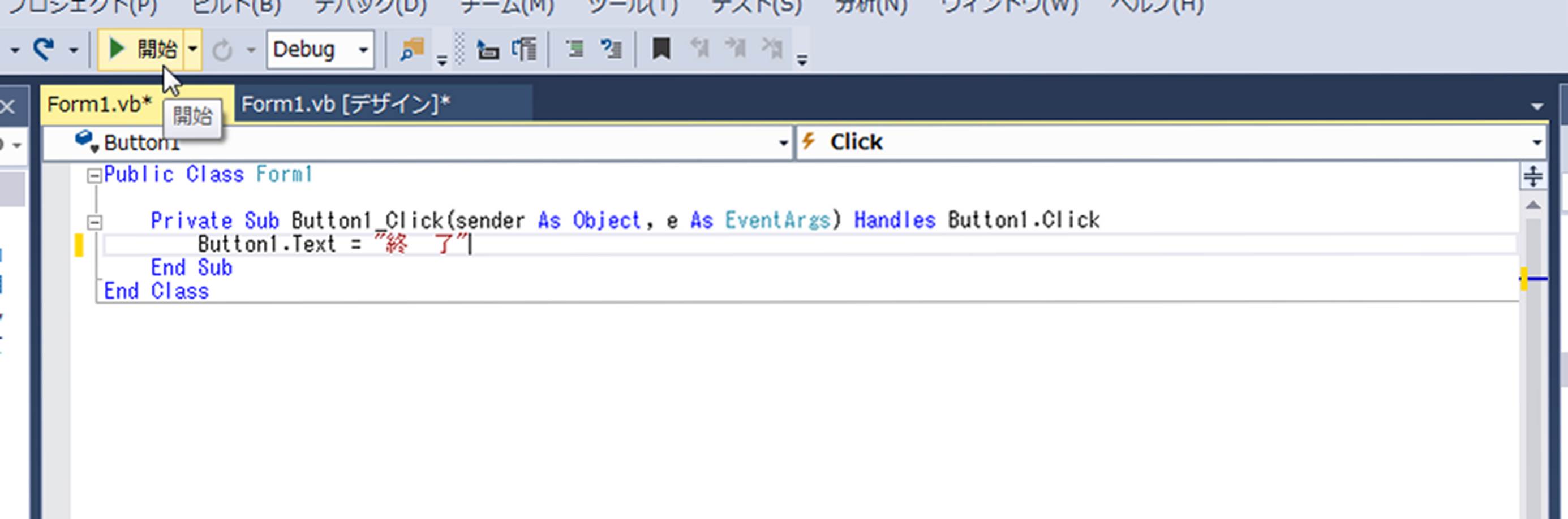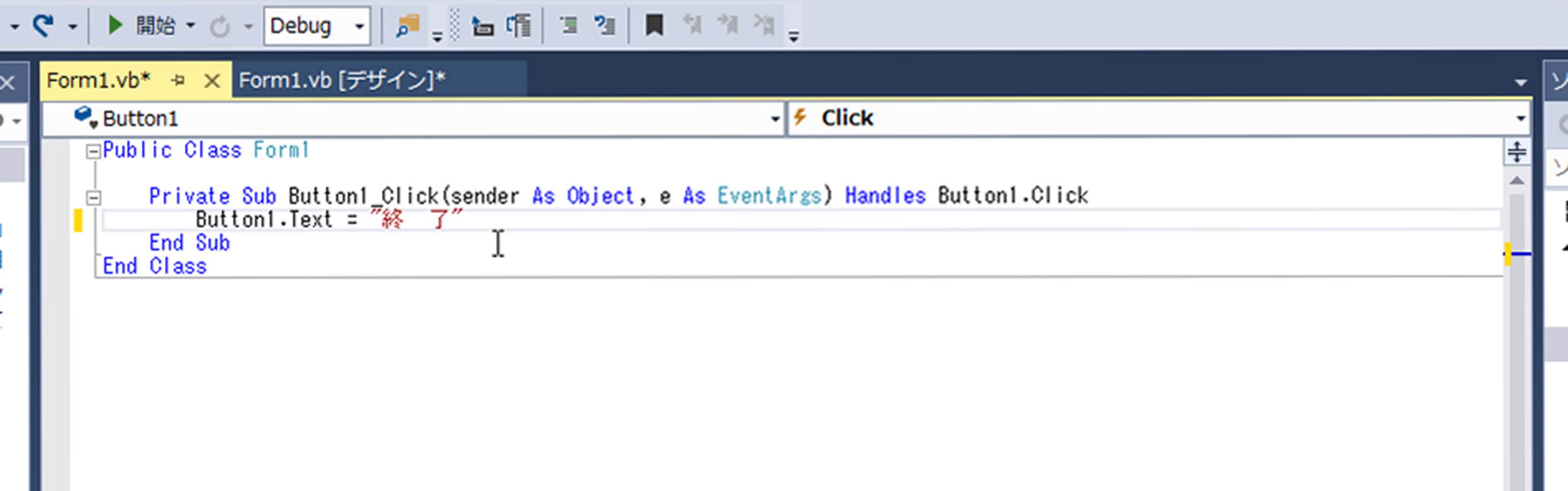 「Button1」というボタンのTextを(今の段階では”クリック”になっている文字)を”終 了”に変えることを表しています。すなわち、イベントが発生すると、Text の文字列が変化することになります。