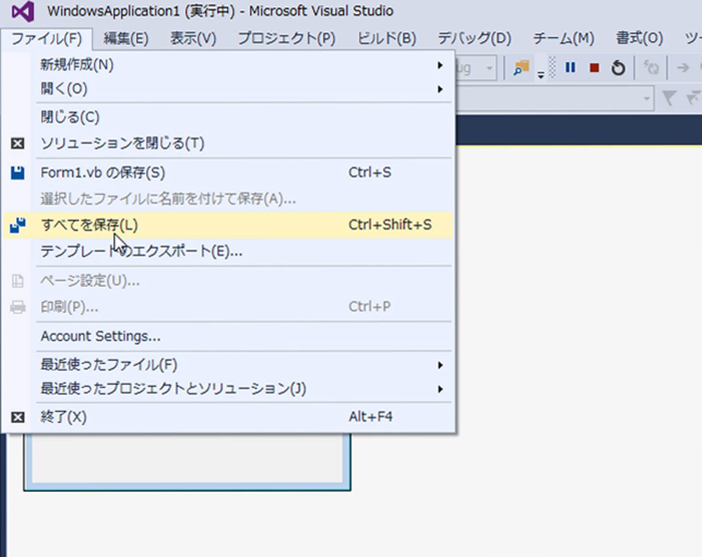 7.すべてを保存でここまでを保存してみましょう。名前は,プロジェクトファイルは,“WindowsApplication1”と,フォームは” Form1.vb”となります.(名前をつけて保存する場合には,その上の「名前をつけてForm1.vbを保存」を選択します.)