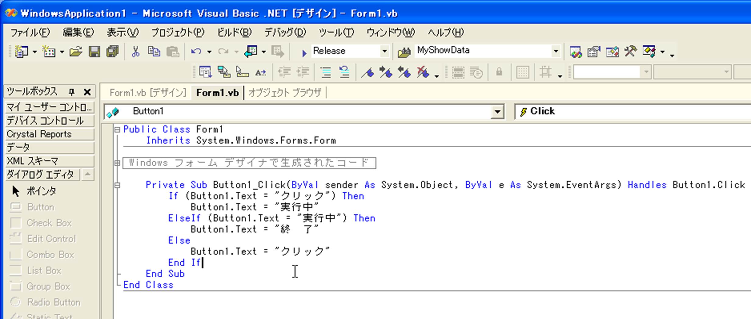 以上のことを参考に先ほどの押しボタンのプログラムを改良し,“クリック”のボタンが押されたら,“実行中”とボタンに表示し,“実行中”のボタンが押されたら,“終 了”とボタンに表示するプログラムを作ってください.