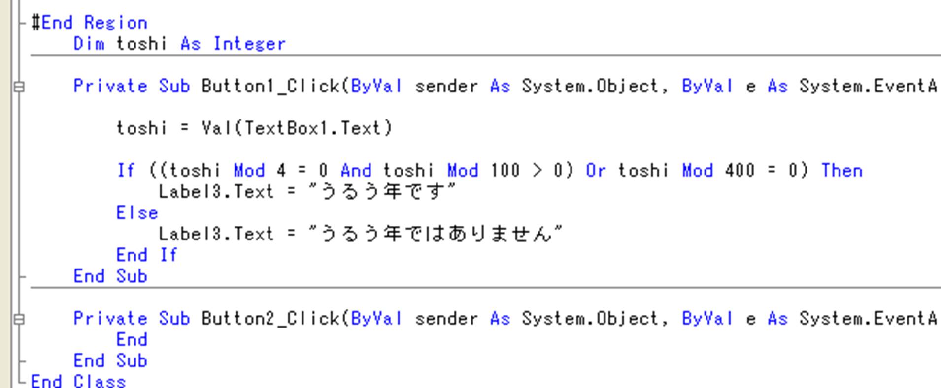 ここで,Label3.Textが判定を表示する部分ですから,そこにうるう年かどうかの文字列を代入します.