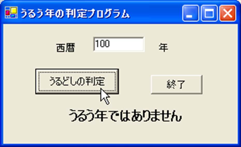 うまく行けば文字入力の部分をクリックして年数を入力し、計算ボタンをクリックするとうるう年かどうか判定します。
