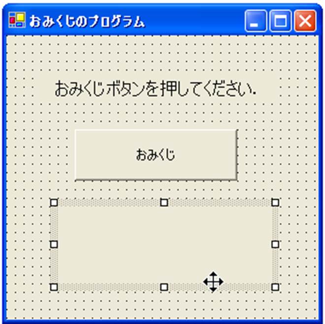 1) 以下のようにフォームデザイナにツールボックス上のLabelとButtonのツールを使って,プログラム説明,おみくじの表示部分,おみくじボタンを配置し,プロパティで表示文字の大きさや文字などをかえておく.なお,おみくじの表示のLabelプロパティにおいて,配置の中の「AutoSize」を「False」にし、さらに「Size」を「100,