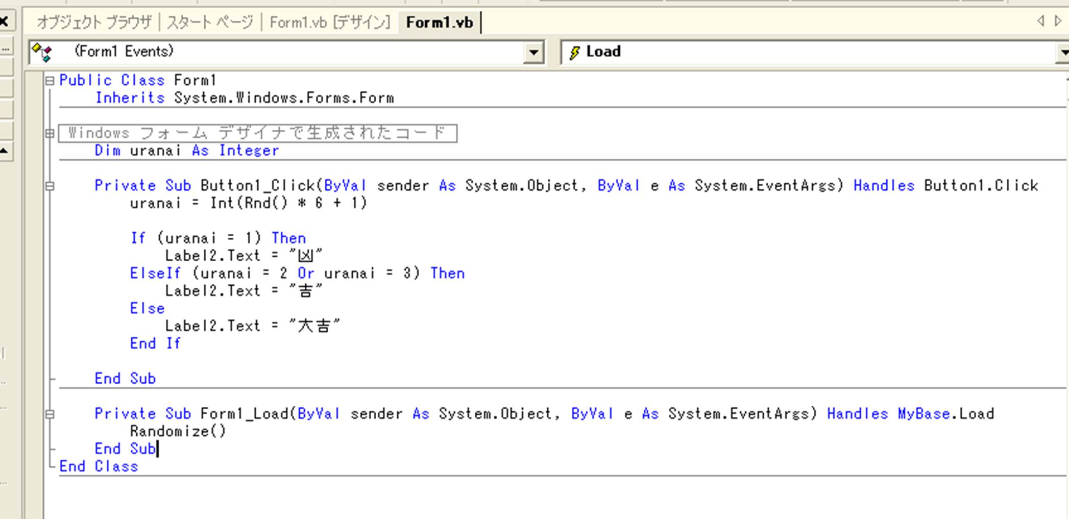 おみくじの出る順番が同じでは,困りますので,「Randomize()」(でたらめの数の出る順番(種)をランダム(無作為)にする命令)」を,フォームをクリックして,ロードされたときには動作するようにしておきます.