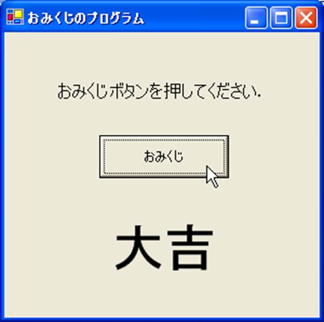 おみくじボタンをおすことで,おみくじ結果が変われば,完成です.終了させ,再度占ったときに,同じ占いの繰り返しでないかを確認して下さい.
