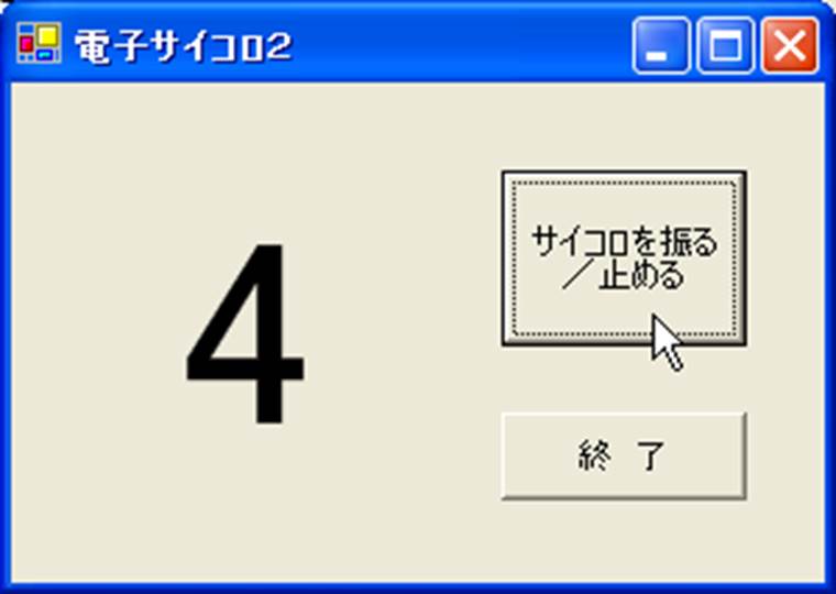 そこで,ボタンを押すことによって,ルーレットのように画面にサイコロの目の値をランダムに表示させ,また,ボタンを押すとサイコロが止まって値が表示されるような,動きのあるプログラムを作成してみましょう.