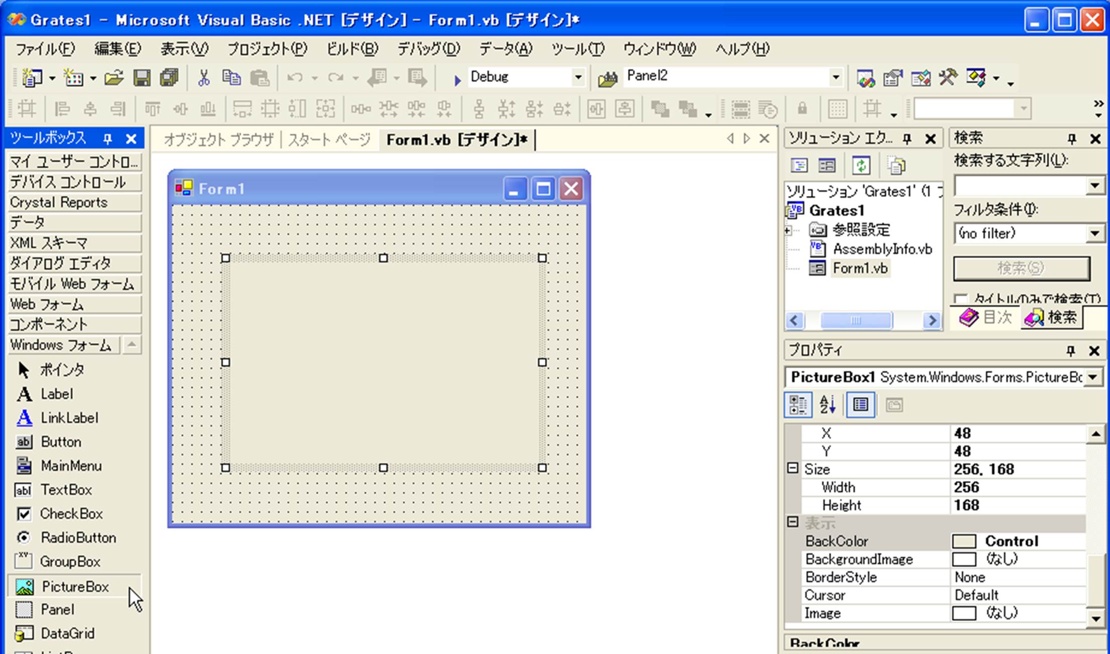 1) これまでと同様にまず, Visual Basic.NETを立ち上げ, 新しいプロジェクトを開き(名前は「grtest1」)、フォームの適当な位置に PictureBoxを1つ作り、PictureBoxのプロパティウインドウでBackColorを変えてみる.