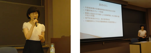 第2部では、来年度の国立大学法人図書系職員の内定を得た本学学生(2名)に、就職活動の開始から内定までの流れ、採用試験の併願状況、試験(教養・専門・面接試験など)の傾向と対策などを報告していただきました。報告は、自身の経験にもとづく具体的な内容となっていたため、これから司書職採用試験の受験を検討している参加者に大いに参考になりました。詳細は、2012年3月刊行予定の『明治大学司書課程・司書教諭課程年報』をご参照ください。