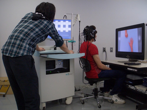 人間の身体は脳の指令によって動いています。では同じように脳の指令から直接、機械を操作することは可能でしょうか?このような技術のことをブレイン−マシンインタフェース(BMI)またはブレイン−コンピュータインタフェース(BCI)と呼びます。BMIは身体が不自由な方への有望な代替手段として、またエンターテイメントやマーケティングなどの分野への応用可能性を秘めた技術だと考えられています。認知脳科学研究室では、主に脳波計を用いたBMIの技術について研究を進めています。