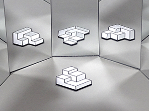 The center image show the object obtained by cutting the thin walls from the object in the left image. We can see that the two side mirrors create natural appearances of the objects, whereas the center mirror gives a little unnatural appearance. Some people perceive a surface consisting of thin plates and orienting upword, but most people perceive an upside-down structure seen from below. This upside-down interpretation cannot be avoided even when we insert a flag emphasizing the direction of the gravity, as shwon in the right image.
