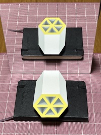 横たわっていたものを鏡に映すと、起き上がります。軸方向がはっきりしたものから、この錯視を作ることができます。