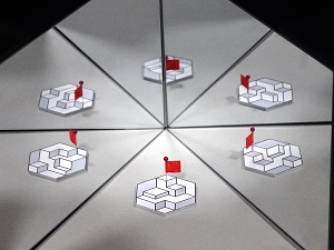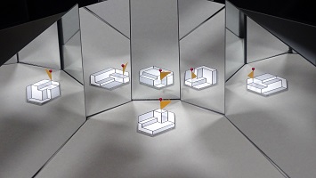 ものの後ろに5枚の鏡を立てて六つの方向から見ると、それぞれ違う立体が見えてきます。これは、三方向変身立体の原理と、高さ反転立体の原理を組み合わせて作ることができます。