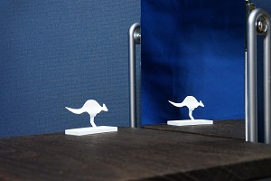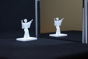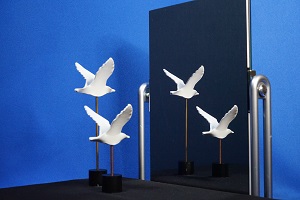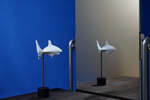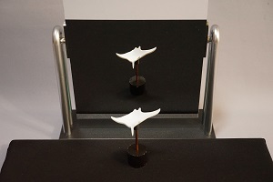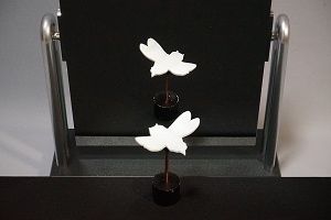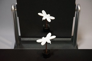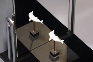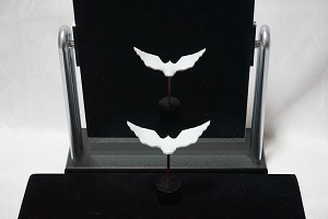 鏡に正面を向いたものは、鏡の中では振り向いて逆を向くはずですが、この立体は振り向かないでそのまま同じ姿勢で鏡の中へ平行移動してしまいます。この錯視は、立体自体を正面から少し向きをずらしたり、見る方向を鏡の正面からずらしたりしても安定に置き続けるという特徴を持っています。