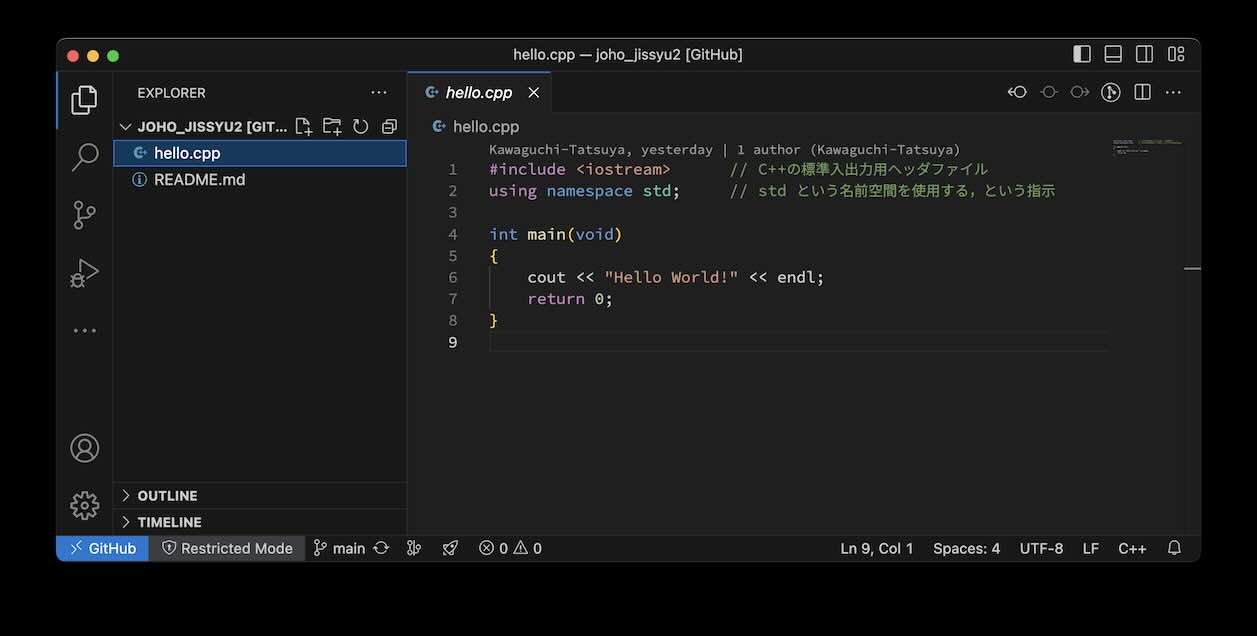 操作方法は,VSCode のエクスプローラメニューの「リモートリポジトリを開く」をクリック,「GitHubからリポジトリを開く」を選択(英語の場合は「Open Remote Repository」をクリック,「Open Remote Repository from GitHub」を選択),次に入力ウインドウに上記のアドレス「https://github.com/Kawaguchi-Tatsuya/joho_jissyu2」をペーストする.