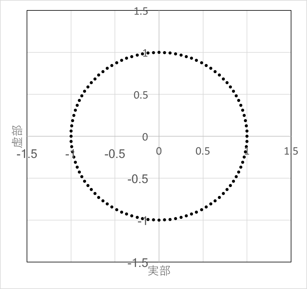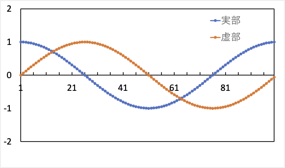 複素数用のライブラリの exp() 関数を利用し,実部,虚部をそれぞれカンマ区切りファイル(csvファイル)に出力し,