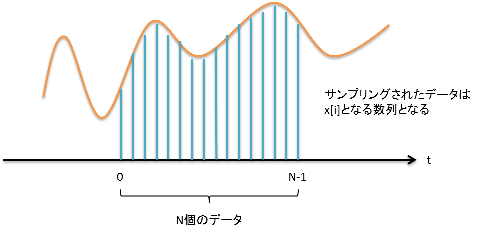 ここでは,連続関数をサンプリングした N 個の有限個の離散データを,C言語の配列風に d[t] と表現する.