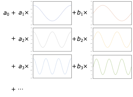 この式は,いろいろな周波数の $\sin, \cos$ 波をある振幅で足してゆけば,任意の関数 $f$ を表すことができることを示している. 言い換えれば,任意の関数は,様々な周波数 $\omega$ にたいする振幅 $a_n, b_n$ に分解(変換)することができる.