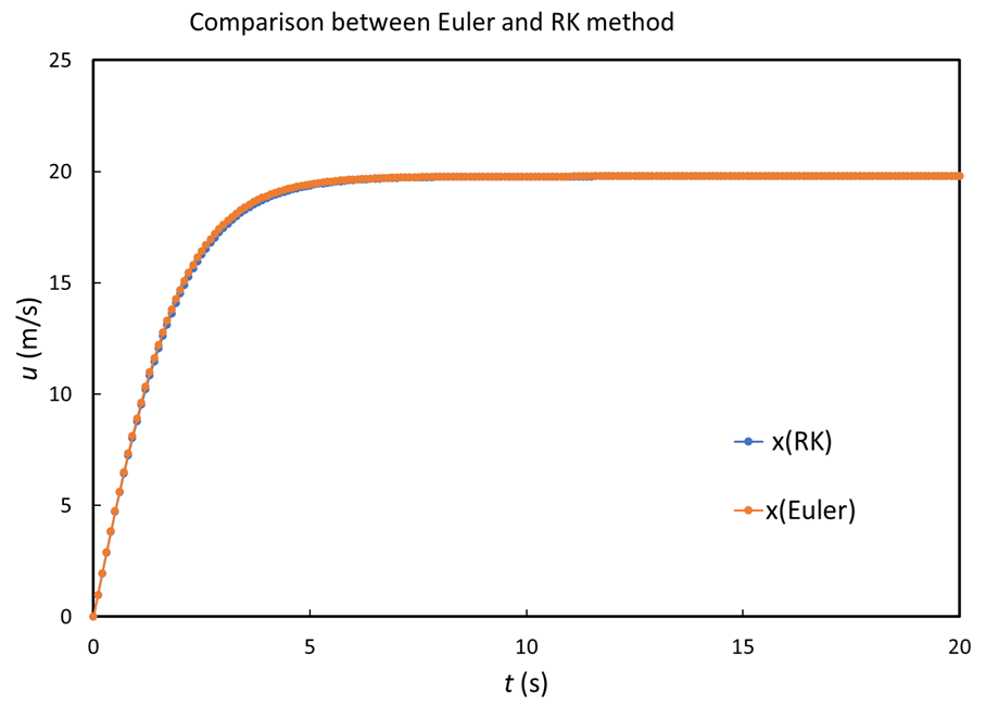 前回の「課題1」の微分方程式を,Runge-Kutta法によって解き,Euler法による解と同じグラフに書いて,比較してみよう.