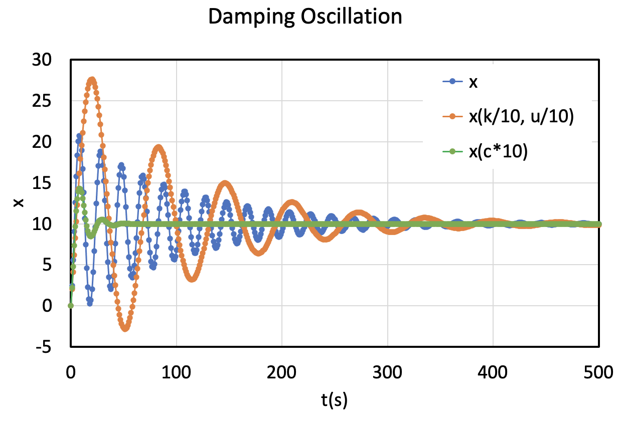 減衰係数 $c$ の値を変えると減衰の程度が変化し,ばね定数 $k$ を変えると振動数が変化する.