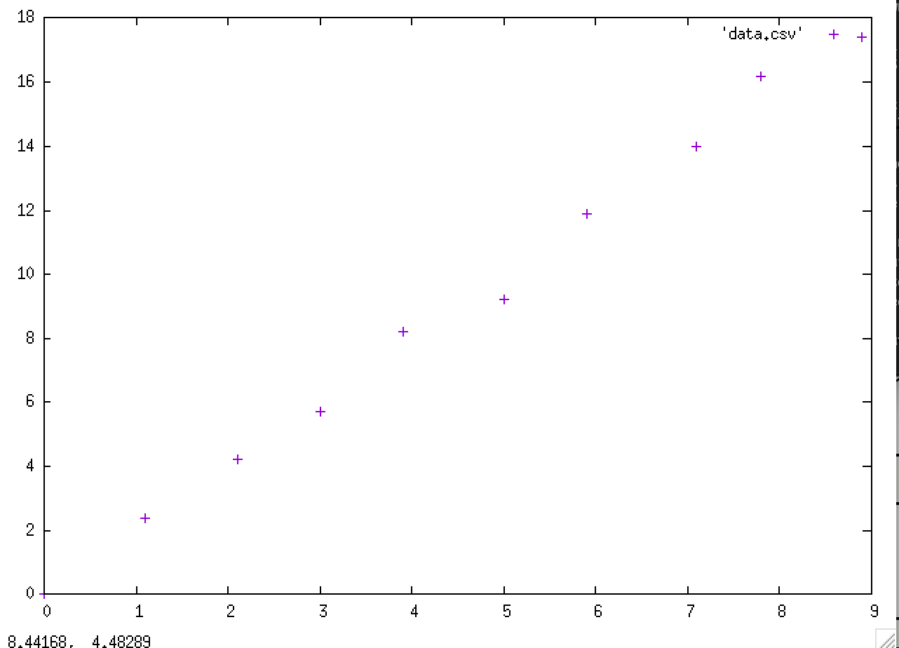 # Result by some experiment 0, 0 1.1, 2.4 2.1, 4.2 3.0, 5.7 3.9, 8.2 5.0, 9.2 5.9, 11.9 7.1, 14.0 7.8, 16.2 8.9, 17.4