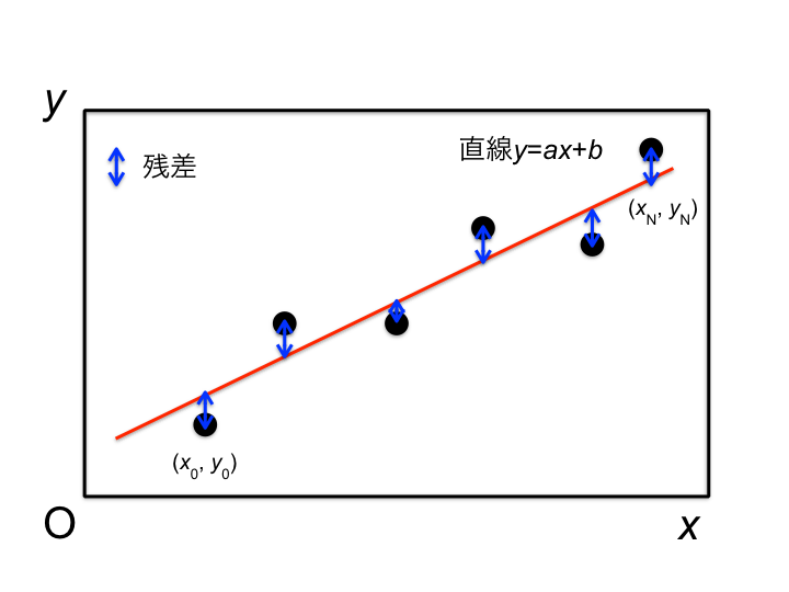 直線と計測点との差(図中の青色矢印の部分)は,当てはめの度合いを示しており,残差と呼ばれる. 残差の合計が小さいほど,直線が点群の傾向をよく表していると言える. 各点における残差の値は正にも負にもなるので,そのまま足すと正負でキャンセルされてしまうため,残差の二乗和を最小化することを考える.