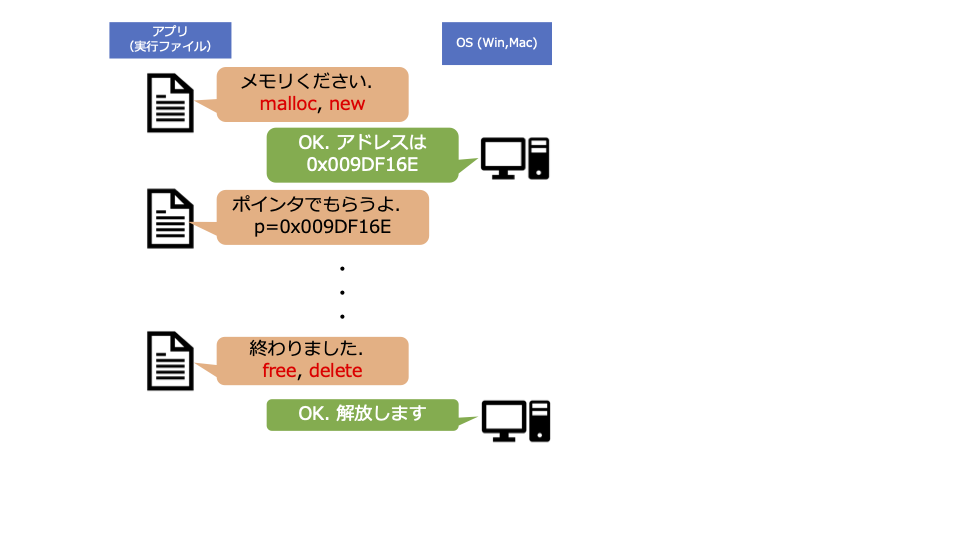 この関数は,確保したいメモリサイズを引数として渡すと,(OSにより許可されて)確保されたメモリの先頭のアドレスを返す.