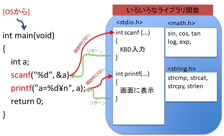 この図では,ライブラリ関数である printf(), scanf()関数を,main() 関数から呼び出している.