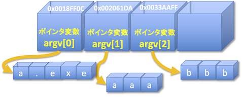 これは,コマンドラインから実行ファイル (a.exe) を実行させたとき,続く文字列をプログラムに渡す際に用いられ,非常に重要な機能である.