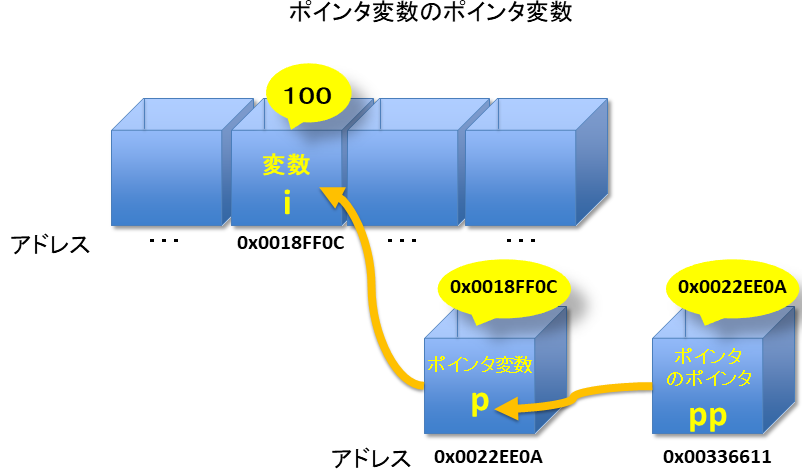 つまり,ポインタ変数の置かれているアドレスを格納するポインタ変数,即ち,ポインタ変数を指すポインタも定義可能である.