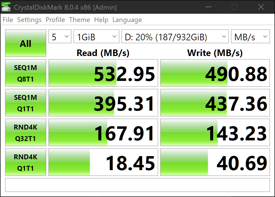 授業で使用する開発環境のインストールでは小さなファイルを数多くコピーするので,この結果の右側,下半分(小さなファイルの書き込み速度)が体感速度に大きく関係している.