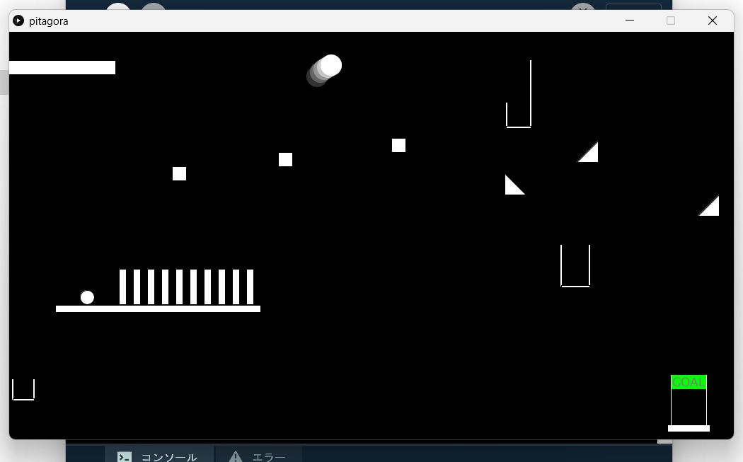 この作品は今年の春学期のメディアプログラミング実験で作成したものです。spaceのキーを押すと画面の左上から白ボールが現れ、右下の[GOAL]に向かってボールが転がって行くというプログラムです。こだわったポイントは始めのボールが跳ねて行くところで少しずつ高く跳ねる様にしたことと、ボールの残像を表示させたことです。