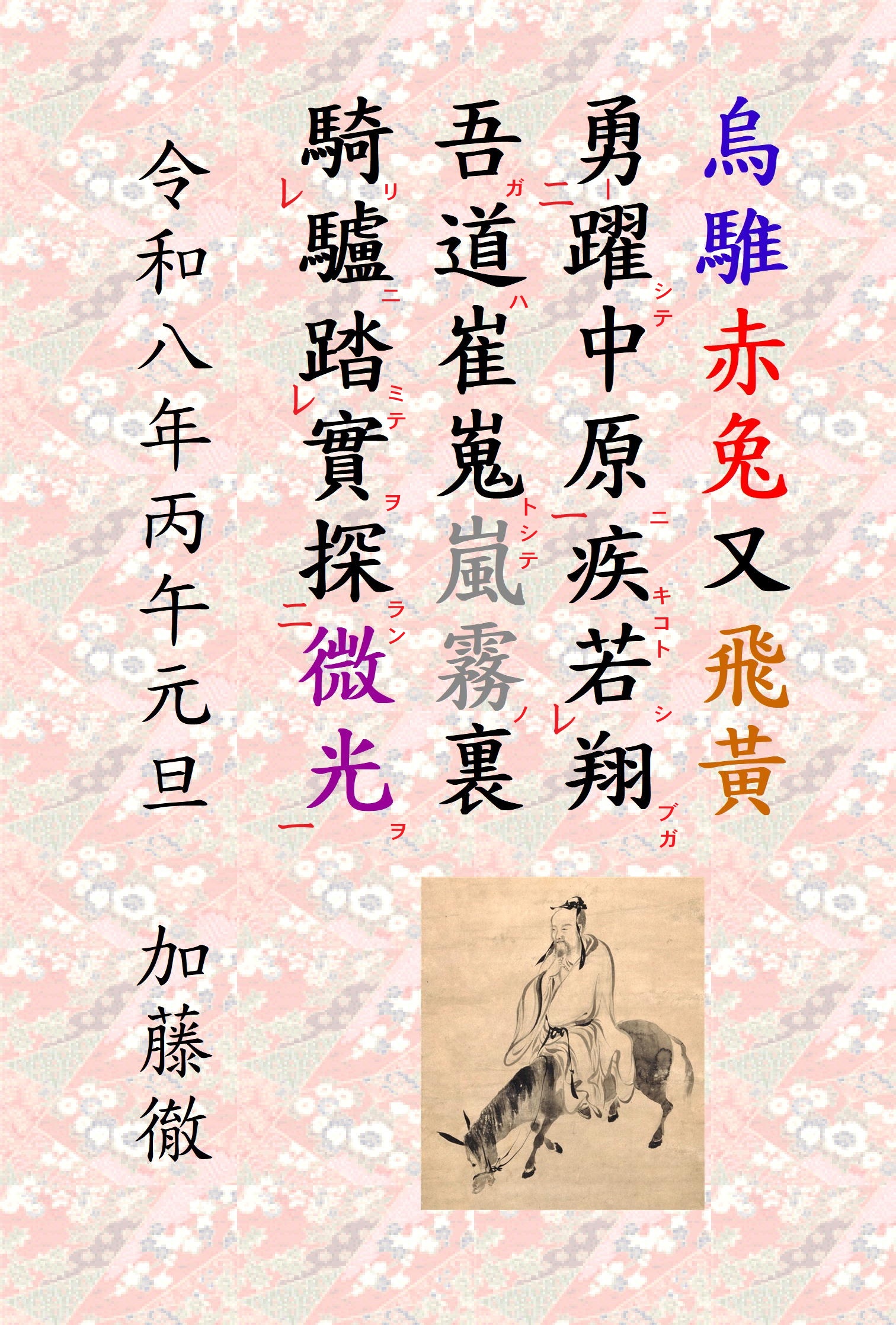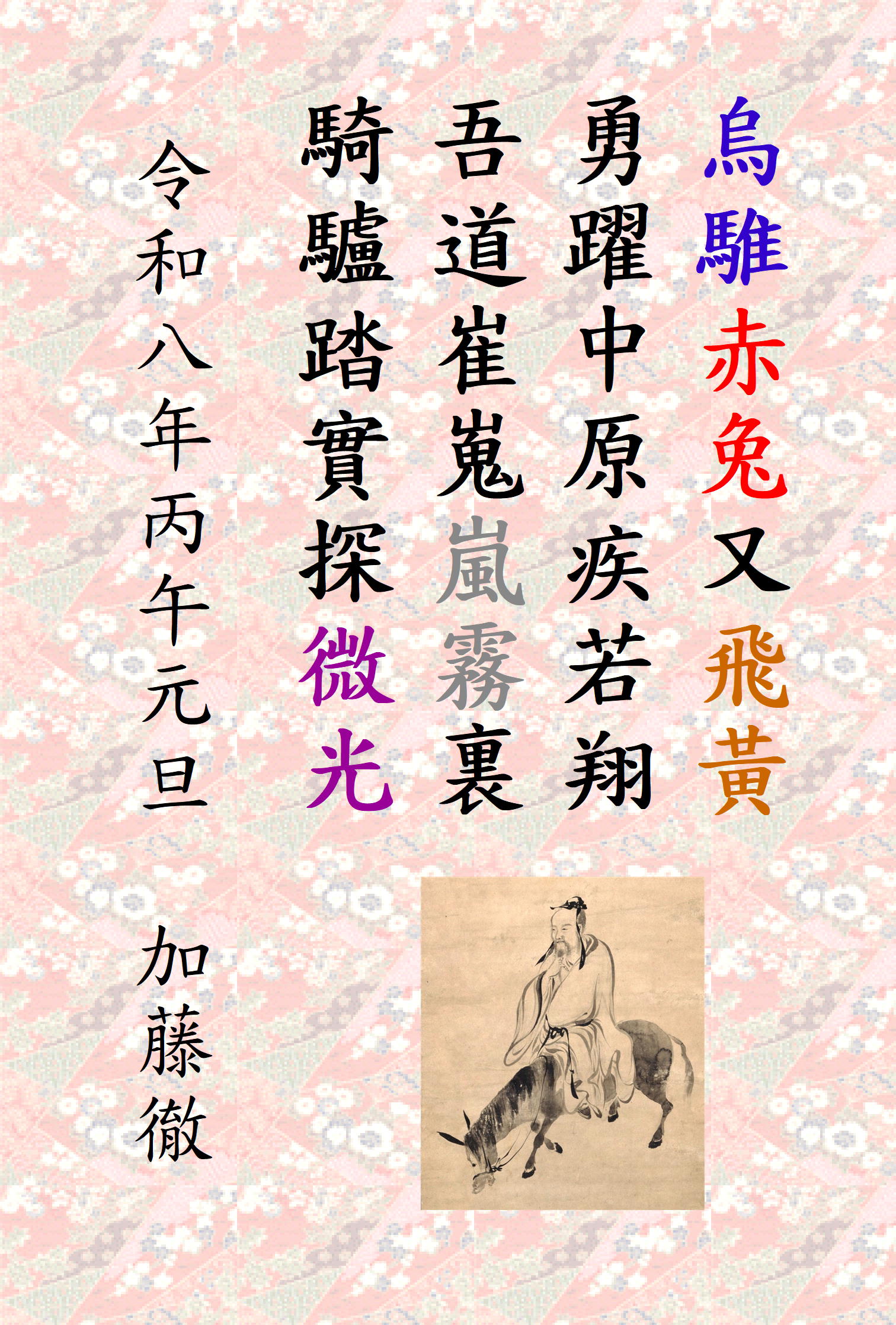 烏騅赤兔又飛黄 勇躍中原疾若翔 吾道崔嵬嵐霧裏 騎驢踏実探微光 (日本漢字)